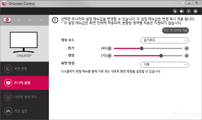 위의 이미지는 직접 손으로 모니터에 부착된 버튼을 움직여 조절하는 방법이지만, 요즘 출시되는 모니터들은 이를 소프트웨어적으로도 구현해 둔 경우가 많습니니다. 즉, 모니터 OSD 조절 프로그램도 함께 배포하는 경우가 많습니다.