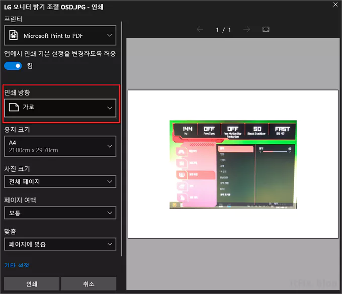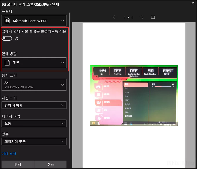 인쇄를 클릭한 다음 나타나는 설정창에서 '앱에서 인쇄 기본 설정을 변경하도록 허용' 옵션을 체크 해제해준 다음 인쇄 방향은 세로로 설정하고 인쇄합니다.