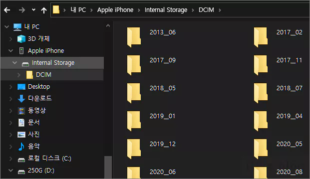 아이폰은 업데이트를 통해 DCIM 폴더의 하위 폴더에 좀 더 편히 알아볼 수 있도록 이미지나 동영상이 들어 있는 폴더명을 촬영 연도와 월을 기준으로 분류해 두는 방식으로 바꾸어서 현재는 이미지 등을 찾아보기가 많이 수월합니다.