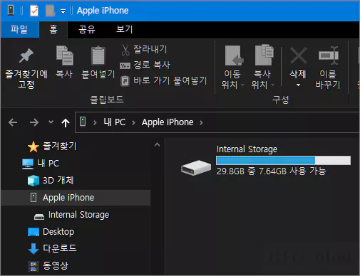 이제 아래의 이미지처럼 USB 충전 케이블을 직접 PC에 연결하면 사진 앱이 아닌 파일 탐색기가 아이폰의 위치로 열린 상태로 뜨게 됩니다. 그 상태에서 아이폰 내부의 폴더를 열고 이미지 등을 잘라내기 또는 복사해 오는 등의 작업을 진행할 수 있습니다.