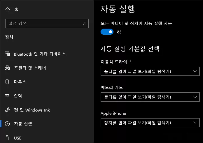 그러한 이유로 아래의 이미지에서 보다시피 이동식 드라이브, 메모리 카드, 아이폰 모두 최초의 연결 프로그램을 파일 탐색기로 지정해 두었습니다. 3개 항목 모두 지정 안 함이라는 설정을 사용할 수 있으므로 외부 하드웨어의 연결이 있더라도 아무런 반응을 보이지 않도록 설정하는 것도 가능합니다.
