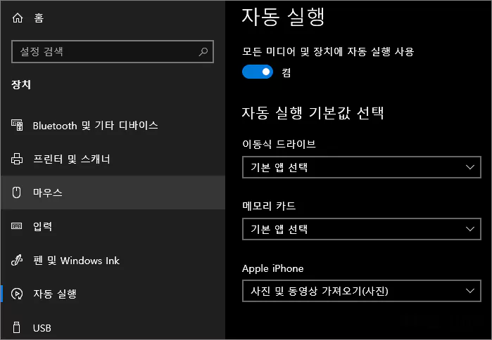 그다음 장치 > 자동 실행 경로로 진입하면 아래의 이미지와 같은 설정 항목을 볼 수 있습니다. 아이폰의 경우에 사진 앱이 자동 실행되도록 설정되어 있는 것이 보입니다.