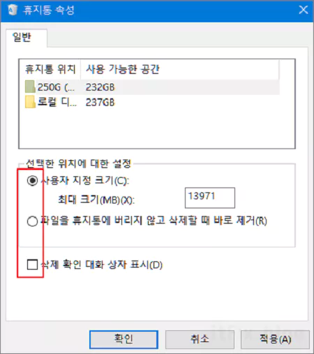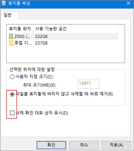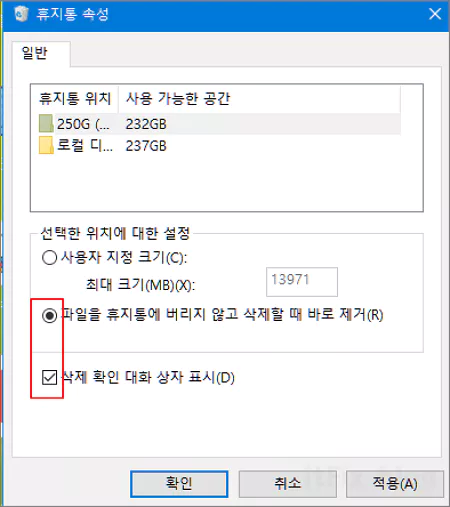 이 방법은 제가 사용 중인 방법으로 파일 삭제 클릭 시 대화 상자 없이 바로 휴지통으로 이동하게 됩니다. 이렇게 저렇게 사용하다 보니 이 방법이 제일 편리하더군요. 아래의 이미지에서 처럼 두 곳의 체크 표시를 모두 제거하면 됩니다.