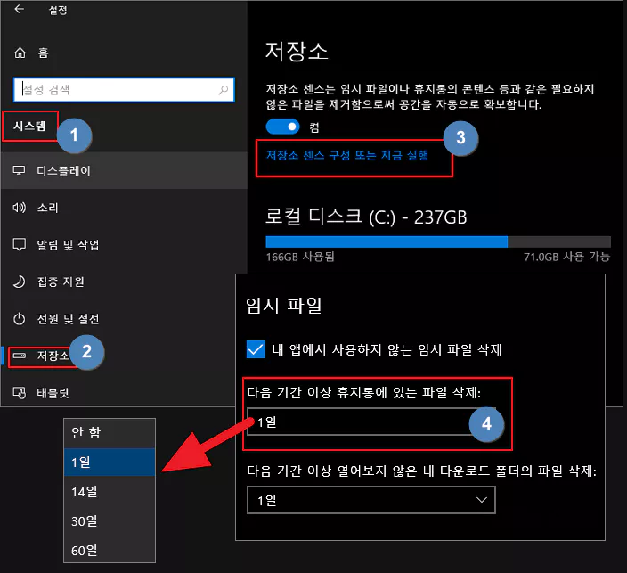 휴지통 자동 정리 설정은 윈도우 설정 > 시스템 > 저장소 > 저장소 센스 구성 또는 지금 실행에서 1일, 14일, 30일, 60일의 4가지 보존 기간 중 하나를 선택해 설정해 둘 수 있습니다. 이 기간이 지나면 휴지통은 보관 중인 파일을 자동으로 영구 삭제합니다.