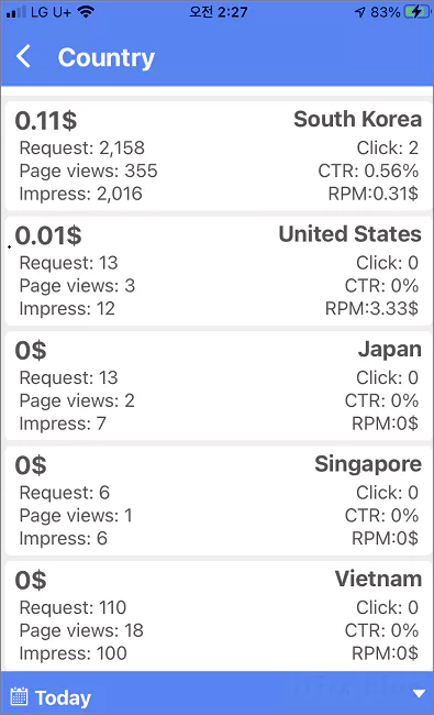 물론, 웹상에서 일일 수익 등의 상황을 조회해 볼 수 있지만 간단히 확인해 볼 수 있었던 애드센스 앱만큼의 편의성을 가지진 못한 것 같습니다.