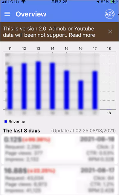 먼저 테스트한 무료앱은 AdSense Management라는 앱이었는데 데이터는 잘 나오지만 다른 데이터를 조회하기 위해 터치하면 어느 정도의 시간이 있는 비디오 광고를 시청해야 해서 바로 삭제했습니다.