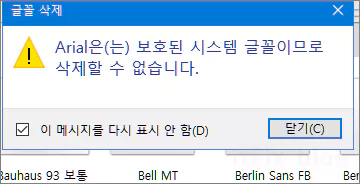 그다음 미리 보기 옆에 있는 삭제 버튼을 누릅니다. 그러면 기본 글꼴들은 삭제할 수 없다는 메시지 창이 뜨게 되는 데 이는 기본 글꼴을 제외한 나머지 추가된 글꼴들은 삭제할 수 있다는 말이 됩니다.