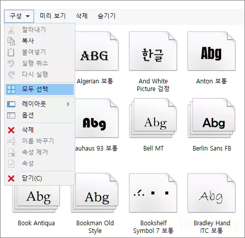제어판의 글꼴 항목에서 구성을 클릭한 다음 모두 선택을 클릭해 모든 글꼴 폰트를 선택합니다.
