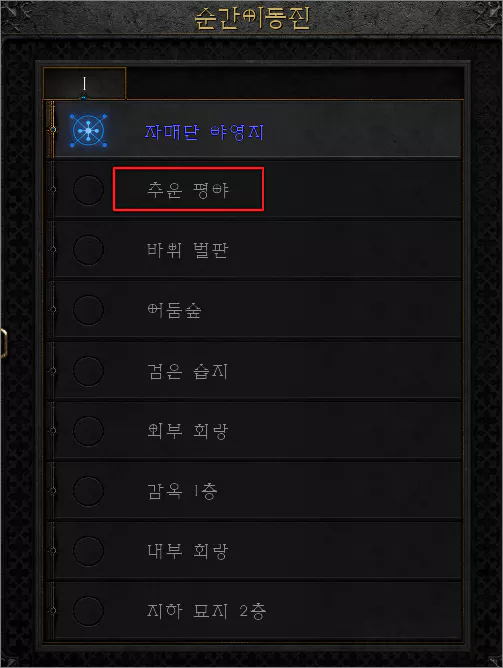 자매단 야영지에 있는 순간 이동진을 클릭해 보면 추운 평야는 두번째의 지점으로 아직 활성화가 안되었으므로 필드로 나가 두 번째 지점을 찾아야 합니다.