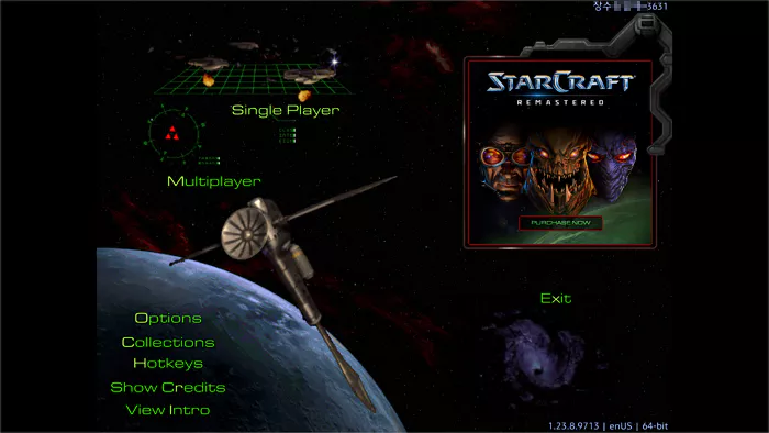 설치가 완료되고 첫 게임 접속 화면은 아래와 같은 이미지인데, 오른쪽 부분에 스타크래프트 리마스터 버전을 구입하는 정사각형 배너가 보입니다. 무료 스타크래프트로만 플레이하고자 할 경우에는 스타크래프트 리마스터 배너를 클릭하지 않고 그냥 멀티 플레이나 싱글 플레이를 눌러 게임을 진행하면 됩니다.