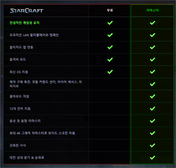 무료 플레이 가능한 클래식 스타크래프트와 16,500원에 구입해야 하는 리마스터 버전과의 차이점은 아래와 같습니다. 그래픽과 약간의 추가 옵션이 있긴 하지만 본질적으로 게임 옵션은 동일합니다. 당연히 무료 버전에서도 블리자드 멀티 플레이가 가능합니다.