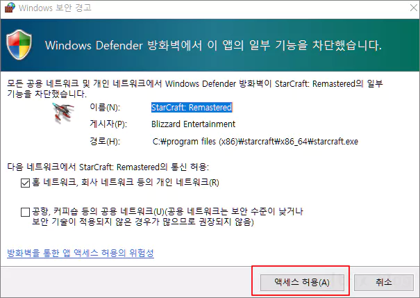 이후 오지랖 넓은 윈도우 디펜더가 참견할 수 있는 데 방화벽에서 스타크래프트를 차단하려고 하면 액세스 허용 버튼을 눌러 줍니다.