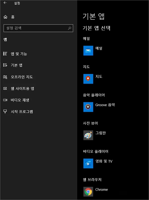 그 항목은 아래의 이미지에서 보다시피 메일, 지도, 음악 플레이어, 사진 뷰어, 비디오 플레이어, 웹 브라우저 등 6가지 항목입니다. 예를 들어 기본이 되는 웹 브라우저를 크롬에서 엣지로 변경하고 싶다면 여기서 크롬을 클릭한 다음 엣지로 변경해 주면 됩니다.