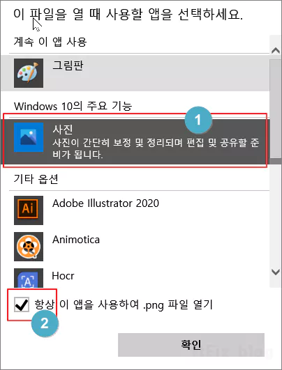 다른 앱 선택을 클릭하면 열리는 화면에서 가장 위쪽에 있는 현재 연결되어 있는 그림판을 대체해 새롭게 사진을 선택해 준 다음 가장 아래쪽에 있는 '항상 이 앱을 사용하여 .png 파일 열기'에 체크 표시를 해 준 다음 확인 버튼을 눌러 줍니다.