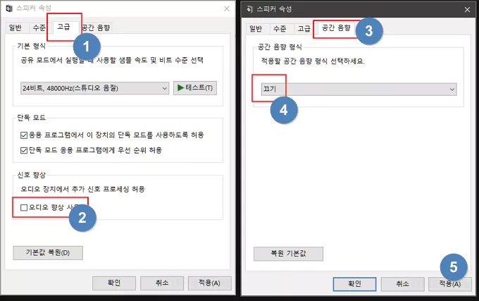 그 다음 공간 음향 탭을 선택한 다음 공간 음향 형식을 끄기로 선택한 다음 하단의 적용 버튼을 누르고 설정을 마무리합니다.