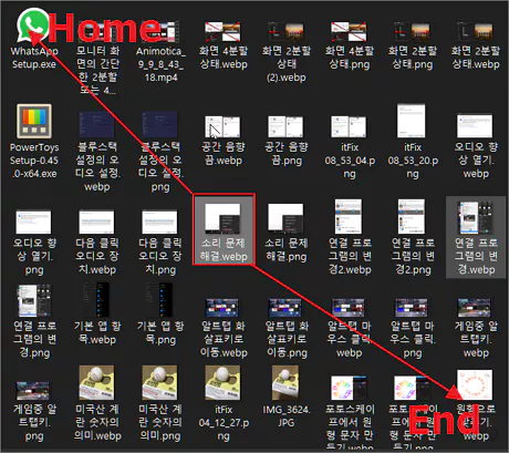 수많은 파일이 들어 있는 폴더에서 중간쯤의 특정 파일이 선택되어 있는 상태에서 Hom 키를 누르면 해당 폴더의 가장 처음 파일로 이동하게 되고, End 키를 누르면 해당 폴더에 들어 있는 파일 중 마지막 파일로 이동하게 됩니다.