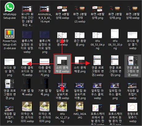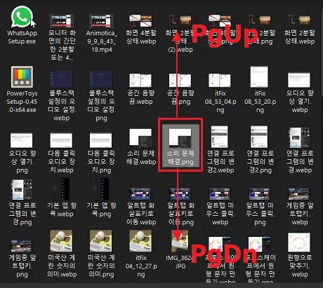 특정 파일이 선택된 상태에서 PgUP(페이지 업) 키를 누르면 수직 방향으로 가장 상단에 있는 파일로 이동하게 되며, PgDn(페이지 다운) 키를 누르면 수직 방향으로 가장 아래에 있는 파일로 이동하게 됩니다.