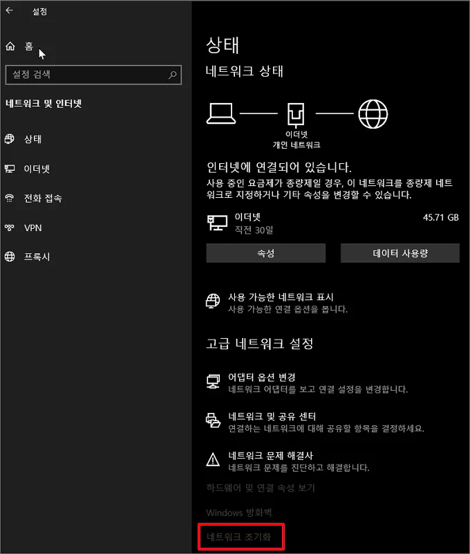 우측 항목 중 가장 아래에 있는 네트워크 초기화를 클릭합니다.