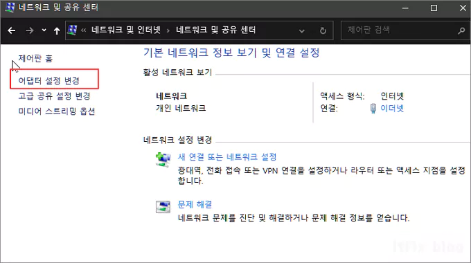그 다음으로 네트워크 및 공유 센터를 클릭하고 기본 네트워크 정보 보기 및 연결 설정 창이 열리면 좌측에 있는 메뉴 중 '어댑터 설정 변경'을 클릭합니다.