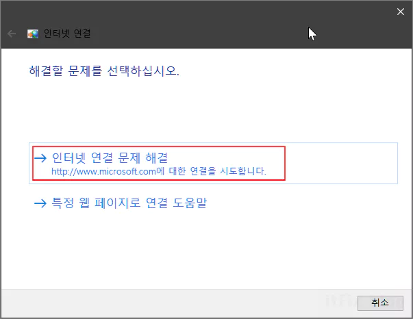 다음 화면에서 인터넷 연결 문제 해결을 선택하고 과정을 진행합니다. 이후의 과정은 일반적인 복구 선택에 따라 진행하면 됩니다. 과정이 모두 끝나면 문제 해결사 창을 닫고 문제가 해결되었는지 검토해 봅니다.