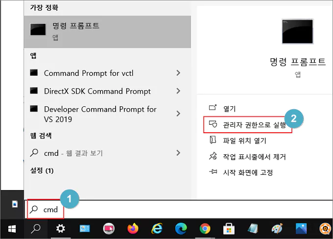 윈도우 작업 표시줄의 명령 상자에 CMD라고 입력한 다음 관리자 권한으로 명령 프롬프트를 실행합니다.