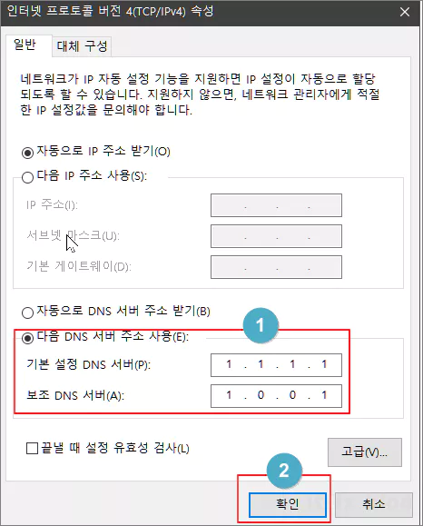 그다음으로 기본 설정 DNS 서버 주소에는 1.1.1.1을 입력해 주고, 보조 DNS 서버 주소에는 1.0.0.1을 입력해 주고 확인을 눌러 줍니다.