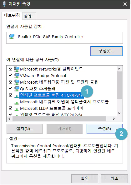 이더넷 속성 창이 열리면 중간에 있는 연결에 사용할 항목의 목록중 '인터넷 프로토콜 버전 4(TCP/IPv4)'를 선택한 다음 아래쪽의 속성 버튼을 클릭합니다.