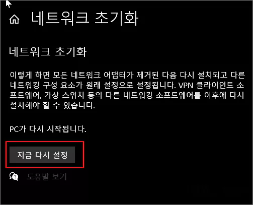 다음 화면에서 지금 다시 설정 버튼을 클릭한 다음 이후에는 윈도우의 요구에 따라 확인 버튼을 눌러 주며 네트워크 초기화를 진행합니다.