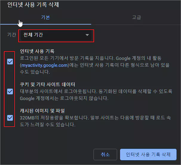 5. 크롬 브라우저의 설정에서 인터넷 사용 기록을 삭제합니다.