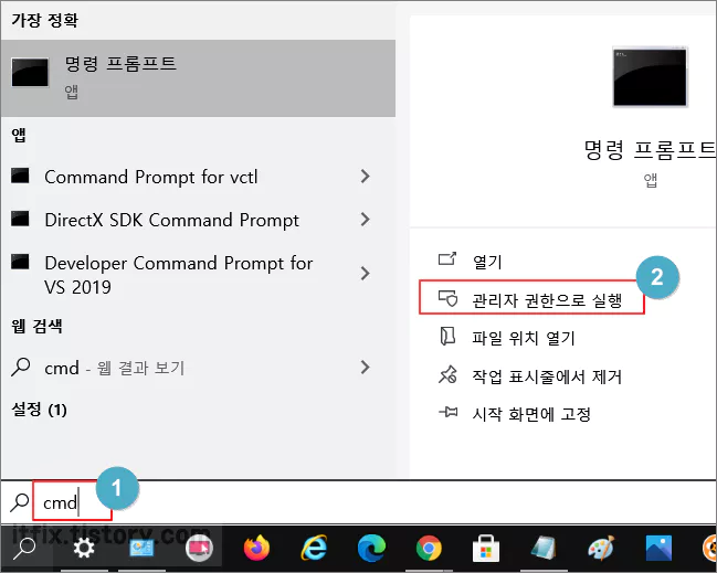 작업 표시줄의 명령 상자에 CMD라고 입력한 다음 관리자 권한으로 명령 프롬프트를 실행합니다.