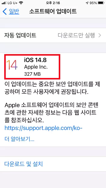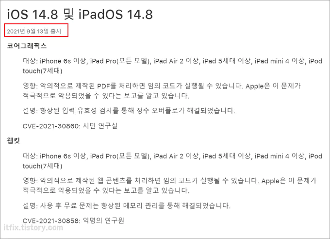 아이폰, 아이패드 등 IOS 버전 14.8 미만일 경우 업데이트 필요