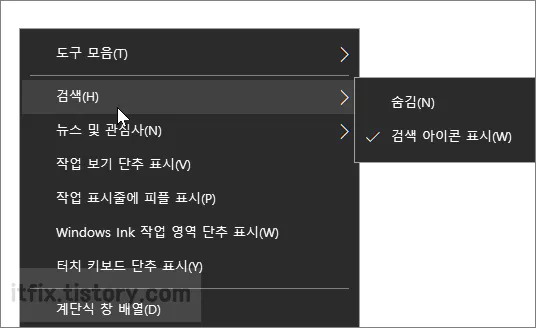 기타 특정한 경우에 작업 표시줄을 마우스 우클릭하였을 경우에 검색 상자 표시 옵션이 없고, 숨김과 검색 아이콘 표시 두 개의 옵션만 존재하는 경우가 있습니다.