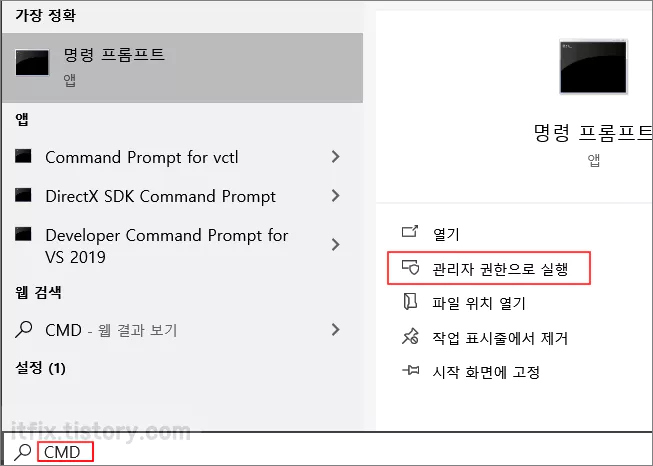 윈도우 하단 작업 표시줄 왼쪽의 명령 상자에 CMD라고 입력한 다음 관리자 권한으로 실행합니다.