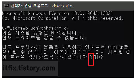 시스템이 다시 시작할 때 이 볼륨을 검사하도록 하겠냐는 물음에 키보드의 Y를 눌러 준 다음 PC를 재시작합니다.