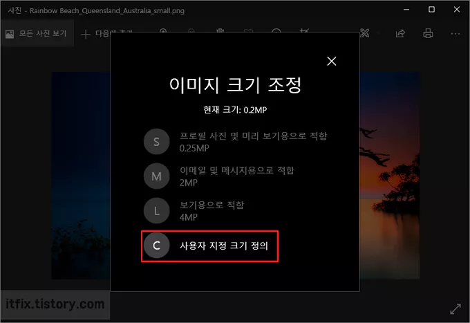 이미지에서 마우스를 우클릭하여 '크기 조정'을 선택한 다음 사용자 지정 크기 정의를 클릭해 줍니다.