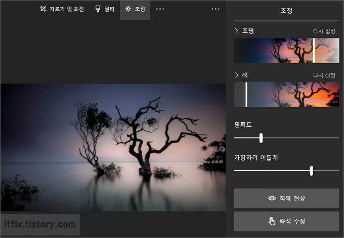 수동 조정이 귀찮은 분들은 상단의 필터 버튼을 누른 다음 적당한 필터 효과를 바로 적용하여 사용하시면 됩니다.