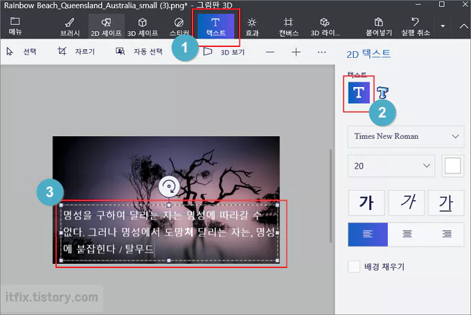 윈도우 사진앱에서 움직이지 않는 텍스트를 넣어야 할 경우에는 자체에서 바로 넣는 것은 아니고 역시 윈도우 기본 프로그램인 그림판 3D에서 최종 텍스트 입력 작업을 마쳐야 합니다.