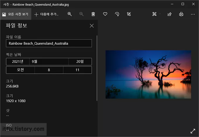 아래의 이미지에서 보다시피 윈도우 사진 앱에서 다운로드한 이미지를 불러온 다음 마우스 우클릭후 정보를 살펴 보면 1920*1080 픽셀의 크기로 배경으로 쓰기에는 이미지가 너무 큽니다.