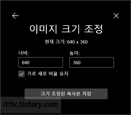 이미지 크기 조정 창이 열리면 너비와 높이를 적당한 크기로 적어 준 다음 크기 조정된 복사본 저장 버튼을 눌러 줍니다.