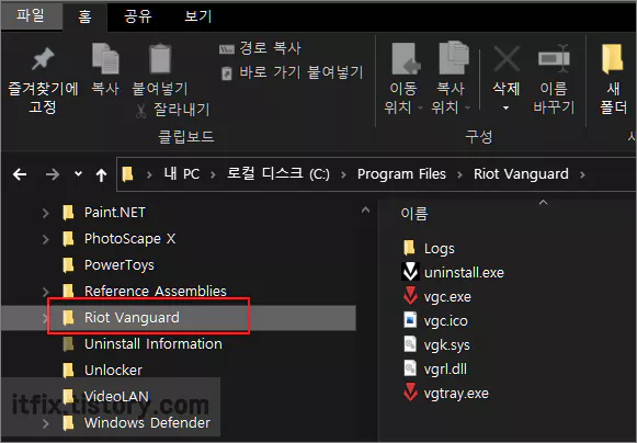 다음으로 파일 탐색기를 열고 C:\Program Files\Riot Vanguard 경로에 있는 Riot Vanguard 폴더를 마우스 우클릭하여 통째로 삭제합니다.