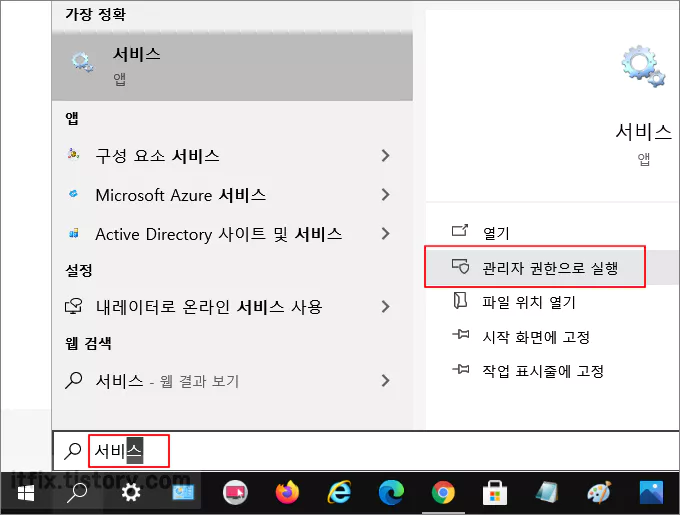 작업 표시줄의 명령 상자에 서비스라고 입력한 다음 관리자 권한으로 서비스 앱을 실행합니다.