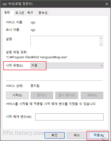 vgc 속성 창이 열리면 시작 유형을 수동에서 자동으로 변경한 다음 적용 및 확인 버튼을 눌러 줍니다.
