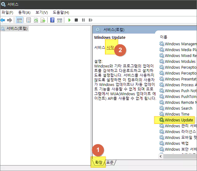 팝업창이 닫히고 난 다음 서비스 창에서 하단의 탭 설정이 확장인 상태에서 윈도우즈 업데이트 서비스 시작 텍스트를 눌러 윈도우즈 업데이트 서비스를 시작시킵니다.