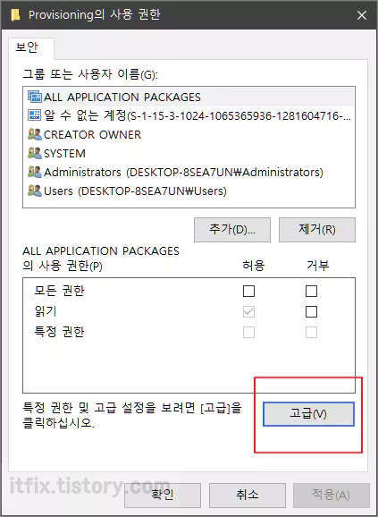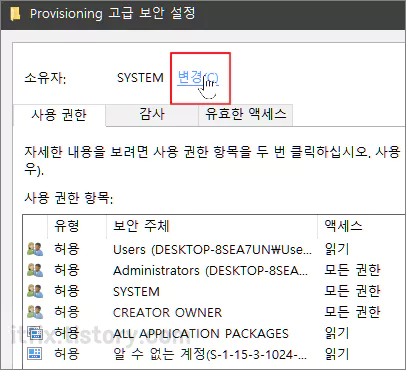 고급 버튼을 누르면 새로운 창이 열리게 되는 데, Provisioning 고급 보안 설정 창에서 SYSTEM 소유자의 변경 글씨를 클릭합니다.
