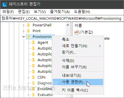 경로로 들어갔다면 Provisioning가 선택된 상태에서 상단 메뉴의 파일 > 내보내기를 클릭해 수정전 현재 상태의 레지스트리를 적당한 이름으로 백업해 둡니다. 이 작업 후에 다시 원 상태로 되돌리고자 할 경우에는 레지스트리 편집기를 열고 상단 메뉴의 파일 > 불러오기를 클릭한 다음 지금 저장한 레지스트리 백업 파일을 불러오면 됩니다.