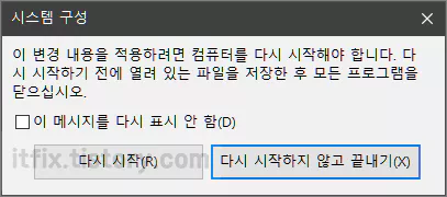 이제 모든 창을 닫고 PC를 재시작해 봅니다. 만일 문제가 생긴다면 위에서 백업해둔 레지스트리 백업 파일을 다시 복원하시기 바랍니다.
