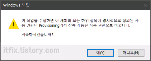 여기까지 작업하면 마지막으로 상속 보안 경고창이 뜨게 되는 데 예를 눌러 줍니다.