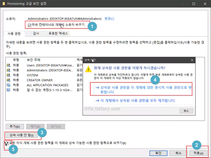 하위 컨테이너와 개체의 소유자 바꾸기 체크 > 적용 > 상속 사용 안 함 > 상속된 사용 권한을 이 개체에 대한 명시적 사용 권한으로 변환합니다 > 모든 자식 개체 사용 권한 항목을 이 개체의 상속 가능한 사용 권한 항목으로 바꾸기에 체크 표시