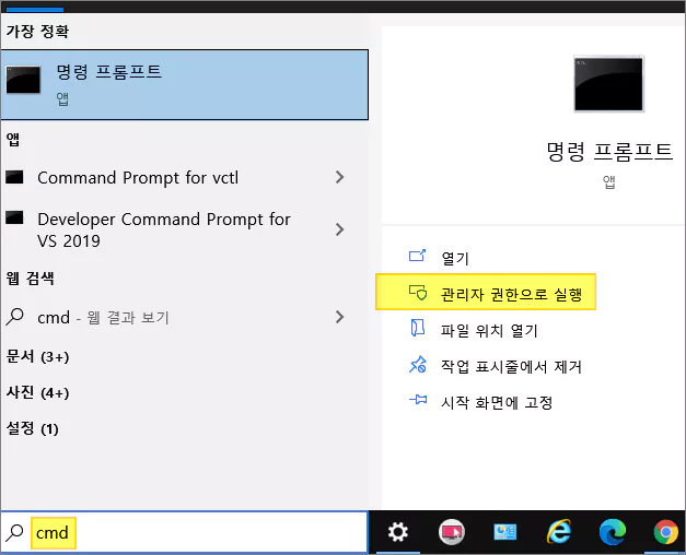 윈도우 작업 표시줄의 검색 상자에 CMD를 입력한 다음 관리자 권한으로 명령 프롬프트를 실행합니다.