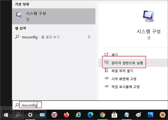작업 표시줄의 검색 상자에 msconfig를 입력한 다음 관리자 권한의 시스템 구성을 실행합니다.